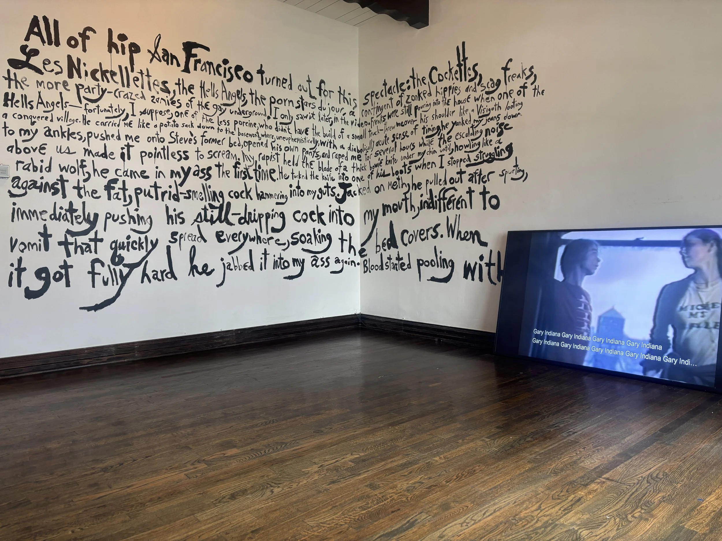 Installation view: Seduction of Patrick (1979) and mural realized together with Loren Kramar from excerpt of Gary Indiana’s book: I Can Give You Anything But Love